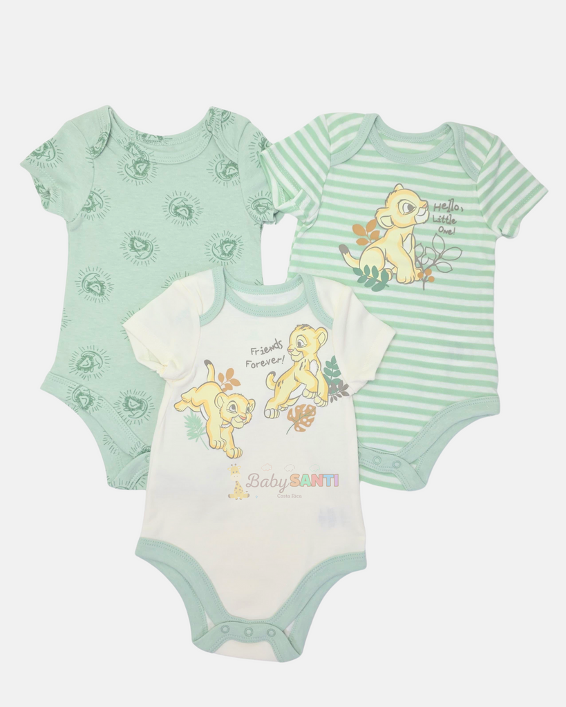 Este conjunto de body de tres piezas súper lindo con diseño de Simba y es perfecto para vestir a tu bebé en cualquier ocasión.